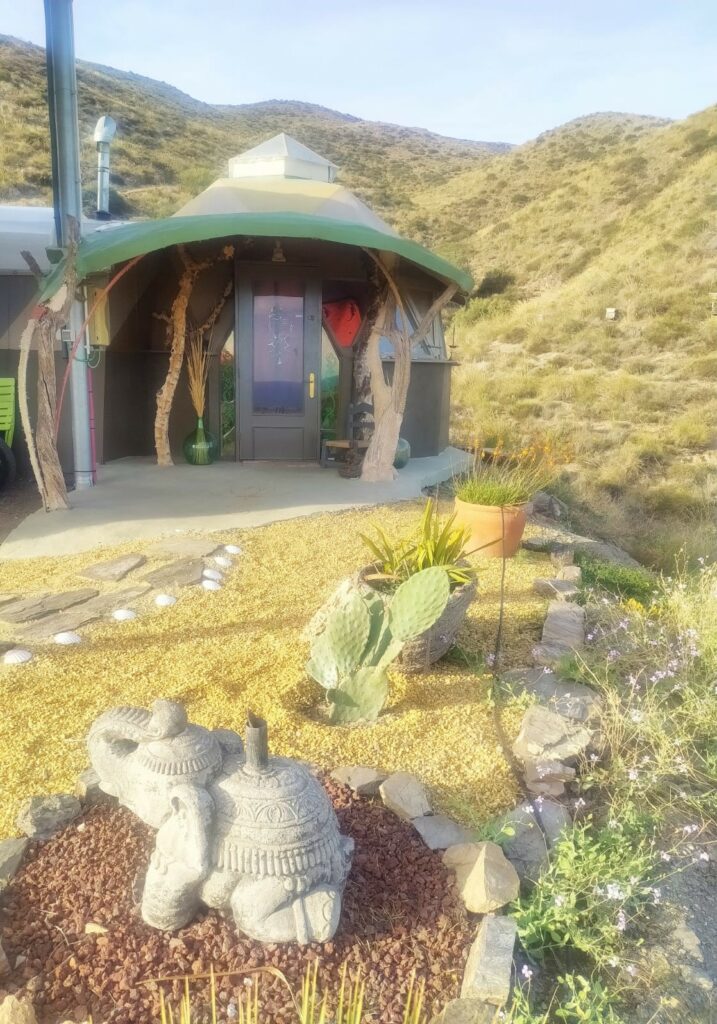 Cet espace est situé dans les hauteurs d’Aguilas, petite ville côtière (35000 hab) à 8km des plages et du centre-ville. Il est très silencieux car notre voisin le plus proche est à 1km de l’autre côté des montagnes. Il a de sublimes vues sur la mer Méditerranée, sur Cabo Cope (montagne assez « spirituelle »). Les soins seront offerts dans un dôme auto-construit avec de nombreux matériaux de récupération (planches, porte, bois déjà utilisés et rénovés…) ou locaux (roseaux, amandiers…)